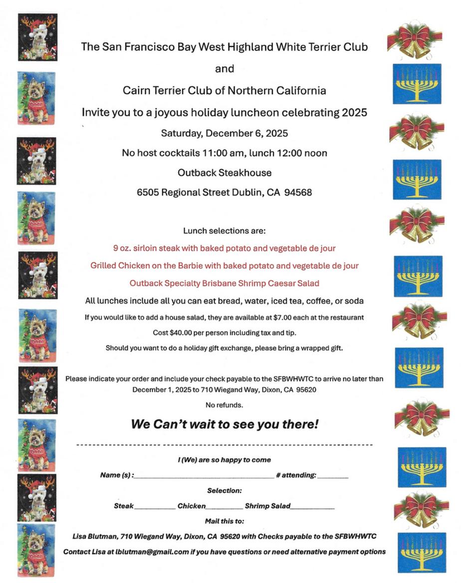 The Cairn folks and the Westie folks are getting together for a Holiday Luncheon. Everyone please come join and get the holiday season off to a great start!